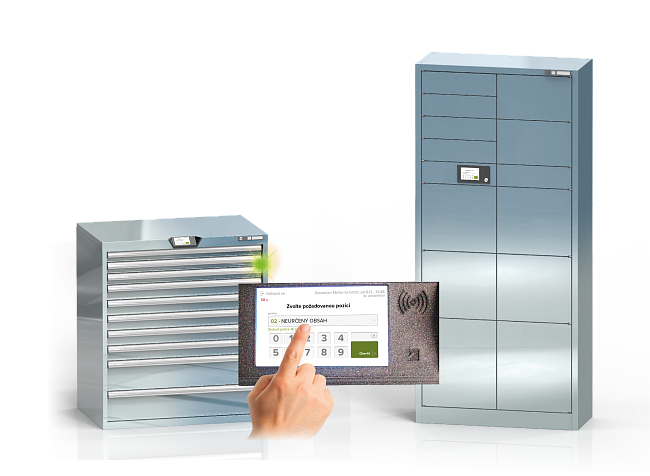 Součástí každé skříně je cylindrický zámek pro nouzové mechanické odemčení, který umožní otevřít všechny zásuvky nebo boxy najednou.